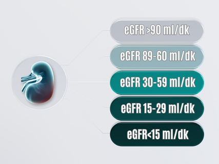 5. Evrede (eGFR<15 ml/dk), son dönem böbrek yetmezliği olarak tanımlanır. Böbreğin yapamadığı işlevleri yerine koyma tedavileri (diyaliz – böbrek nakli) başlanır. Bu tedavilerin başlanmasında yaşanabilecek gecikmeler hayati risk taşır.